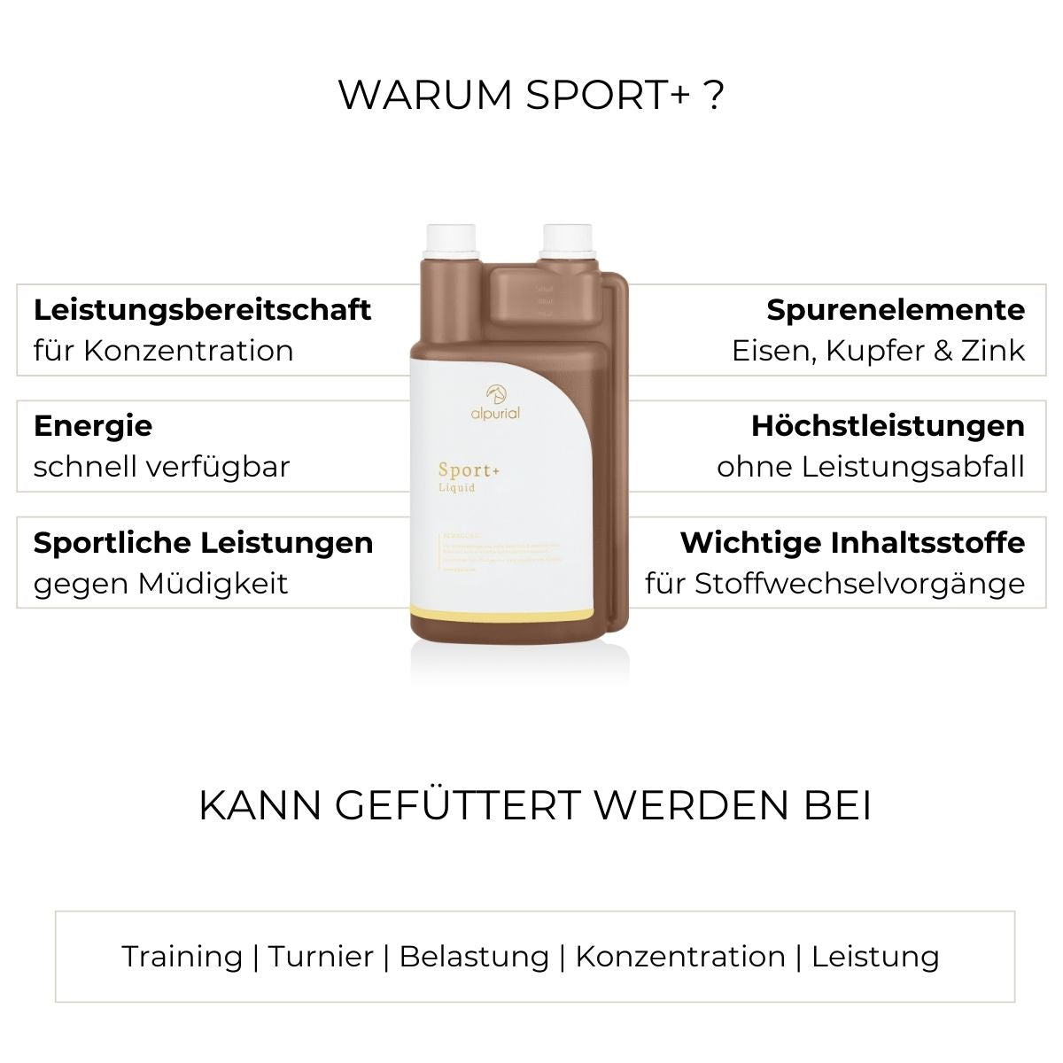 Sport+ ist ein Ergänzungsfuttermittel mit Zink, Kupfer, Eisen. Die Rezeptur wurde speziell für Pferde entwickelt, die im Training oder Alltag zu einer geringen Aktivität neigen oder schwer in Schwung kommen.