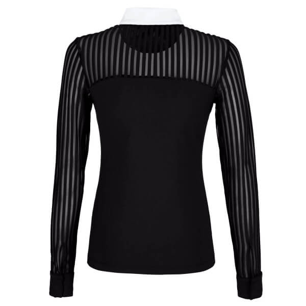 Die Bluse zeichnet sich durch ihre exquisiten Details aus. Die Ärmel, Vorder- und Rückenpasse sind aus gestreifter Meshware gefertigt, die für eine einzigartige Optik und zusätzliche Belüftung sorgt. Ärmelmanschetten und eine verdeckte Knopfleiste unterstreichen die Eleganz, während die Rhinestones-Applikationen an Ärmeln, Kragen und unterhalb der Blende einen Hauch von Glanz verleihen.